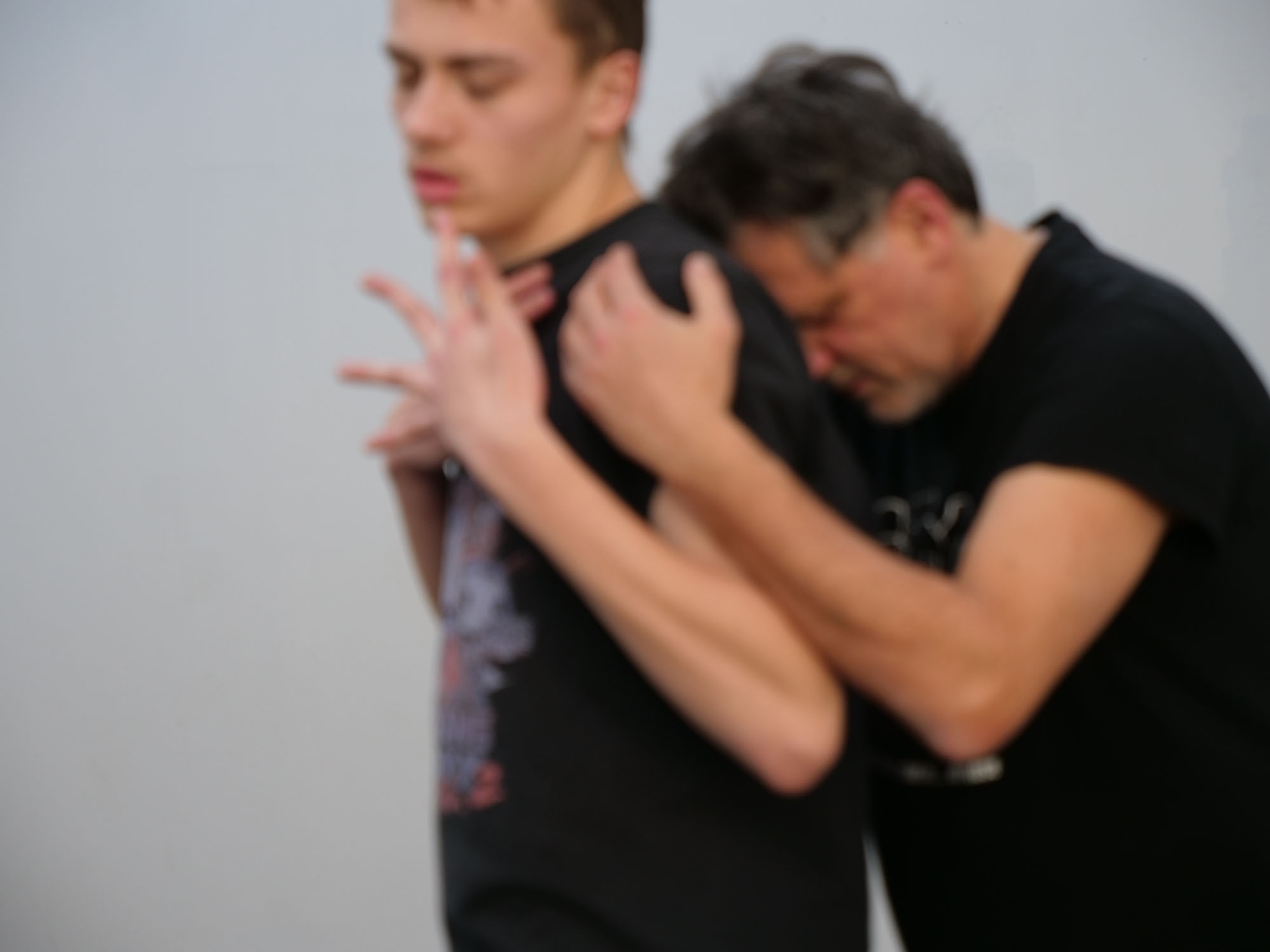 Jules Lebel, 20 ans, physicalité saccadée, est fan d’AC/DC et de danse, qu’il pratique à l’Institut médico-éducatif de Château-Thierry. Stéphane Imbert, corps délié et aérien, est depuis 40 ans artiste chorégraphique — entre autres pour Odile Duboc. Comment se rencontrer malgré une si grande différence d’âge et de corporéité ? Guidés par les chorégraphes Aëla Labbé et Agathe Pfauwadel, Jules et Stéphane font de leurs contrastes un terrain de jeu branché sur flux alternatifs. Tout y est bienvenu : les fulgurances explosives de Jules, leur goût pour les références cinématographiques, les cabanes graciles de Stéphane, les enlacements tendres et les silences. Un espace complice s’ébauche, tout doux, capable d’absorber les aspérités, comme les fragilités.