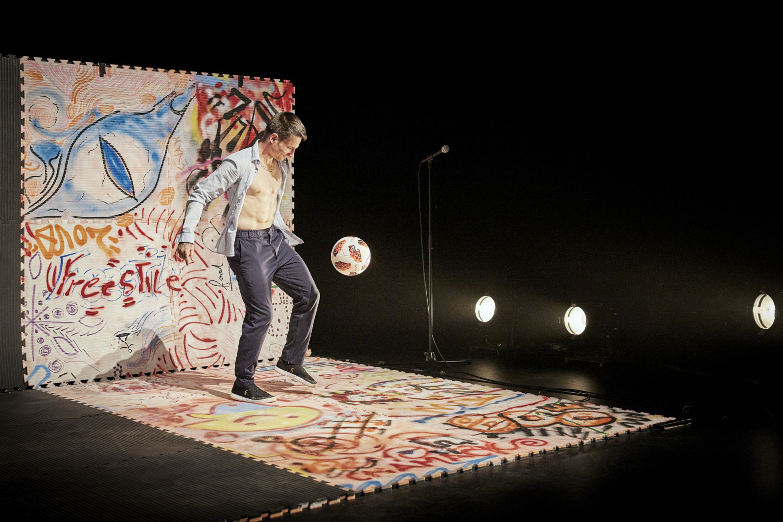 Qui n’a jamais joué avec un ballon de foot à ses heures perdues ? Le jeune Paul Molina, champion de football freestyle, en a fait une vocation, un sport, et désormais un art. Interrogeant son parcours personnel pas banal, qui l’a vu choisir entre son diplôme d’une prestigieuse école de commerce et son sport préféré, il arrive cravaté pour mieux laisser éclater son identité de freestyler. Épaules, dos, pieds, tout le corps s’engage avec le ballon, dans des contorsions très chorégraphiques. Le circassien Wilmer Marquez signe l’écriture de ce tout premier solo en forme de jongle autobiographique présenté ici dans l’espace public. Le jeune artiste y montre autant une explosivité avec le ballon, qu’une intériorité touchante avec les mots.