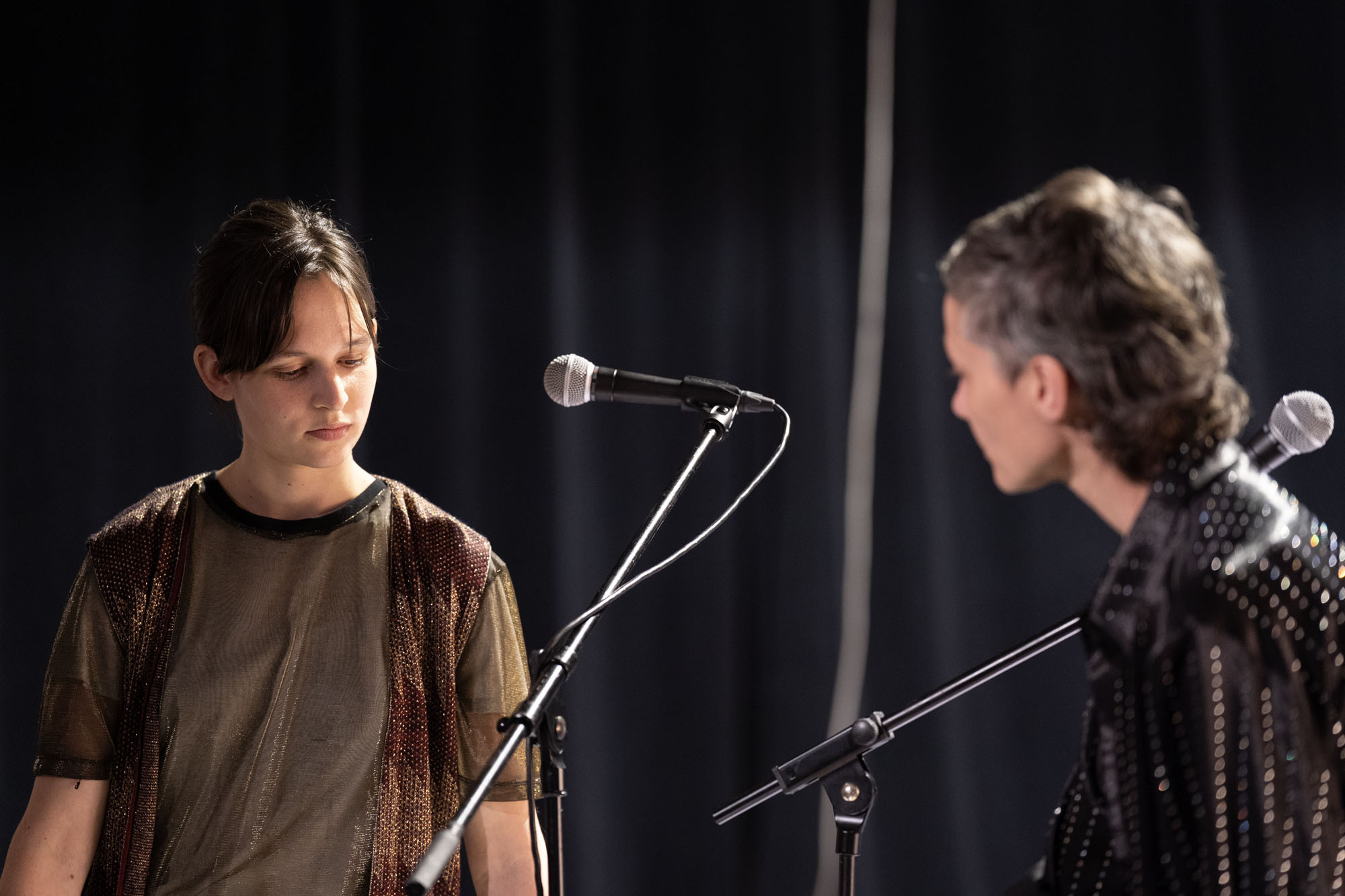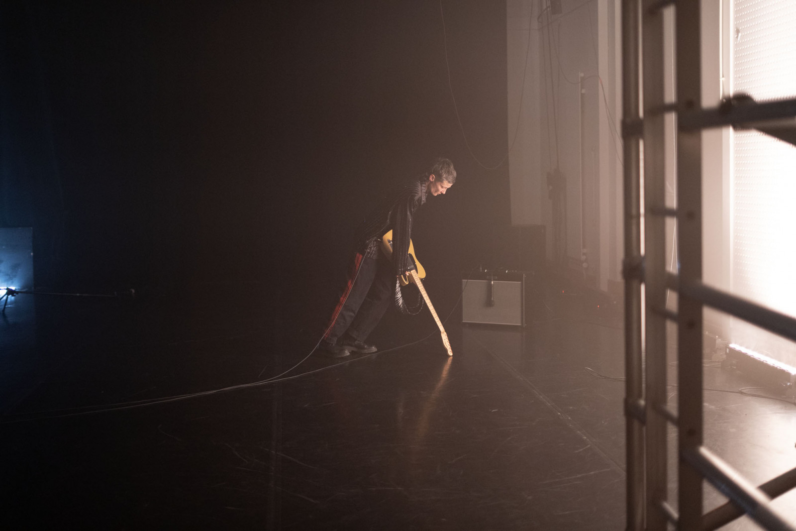 Une guitare posée à terre, qu’un pied irrite, donne le ton. Partager le vide sera la rencontre très électrique entre deux danseuses au vécu et aux âges différents, la jeune Sophia Dinkel et l’expérimentée Marie Goudot, croisées chez Anne Teresa de Keersmaeker. Dans une posture postpunk, elles semblent faire table rase de leur passé d’interprètes et poser les bases d’une relation nouvelle, imprévisible et sauvage. S’accorder passe par des retrouvailles gestuelles en écho, des éloignements solitaires, des prises de micro, des coulées douces à terre et des cordes triturées sans manière. À la fois concert mouvant et danse sonore.
