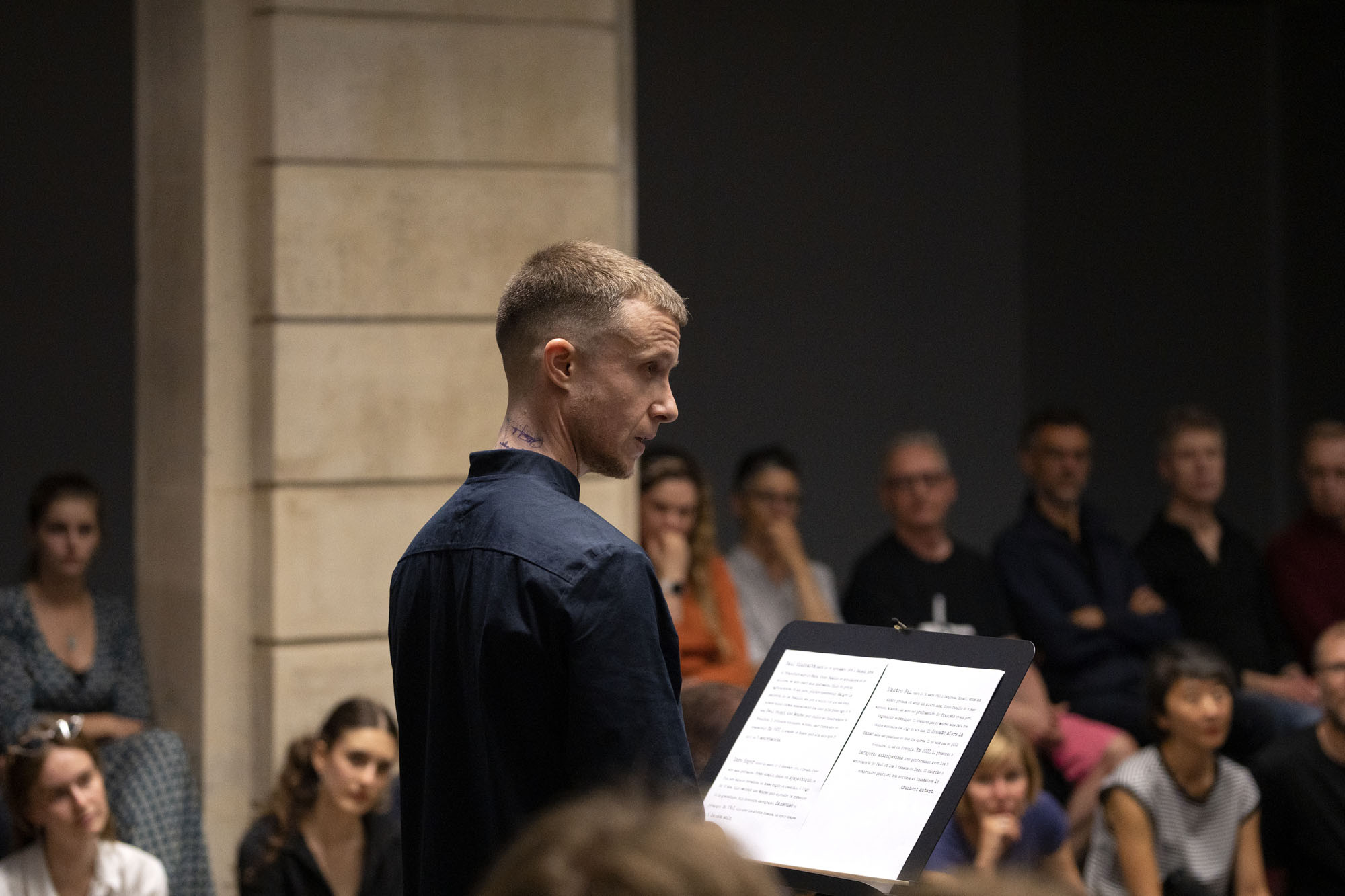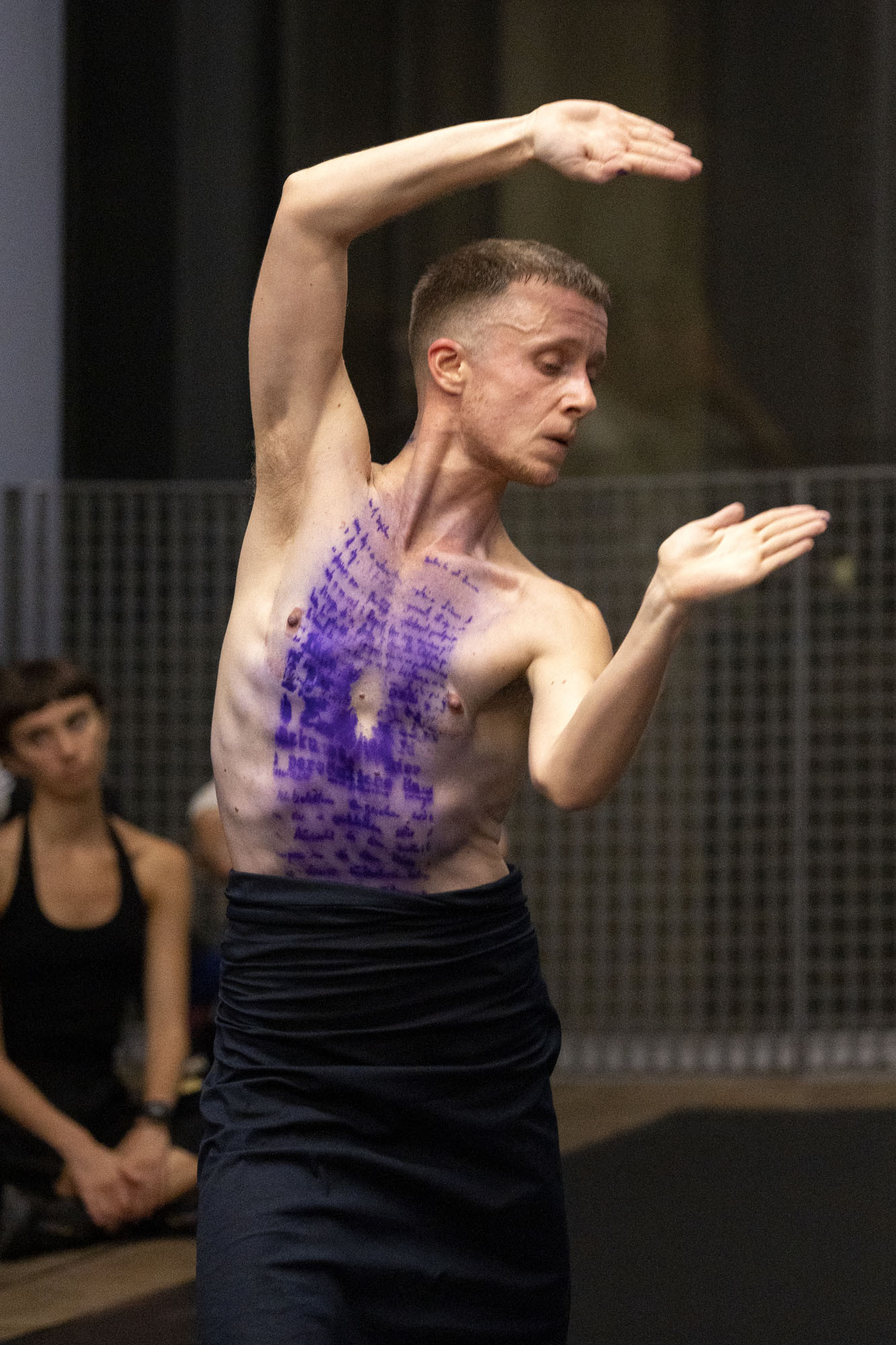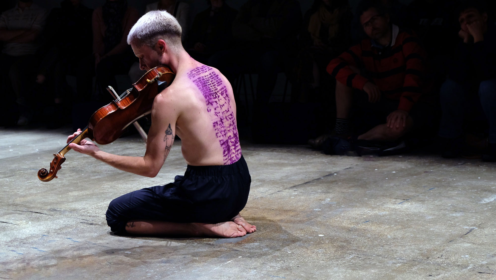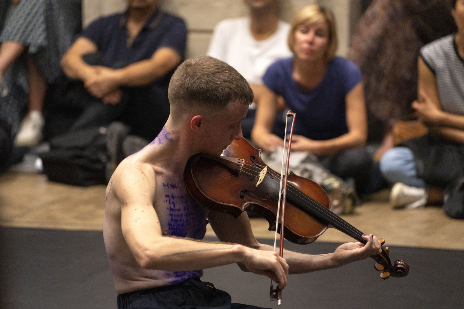 Pol Pi fut musicien avant de devenir danseur puis chorégraphe. Et c’est avec aisance qu’il navigue de l’alto à la danse dans cette performance d’une intense beauté. Y dialoguent des œuvres, aussi épurées qu’expressives, ayant marqué son parcours : la Sonate n° 1 pour alto solo op. 25 de Paul Hindemith, les solos Afectos Humanos de la danseuse Dore Hoyer. Tous deux allemands, tous deux contraints à l’exil en raison des fracas de l’Histoire. Sur un plateau blanc, qu’encadre le public, Pol Pi joue des allers-retours entre son interprétation et les extraits de lettres des deux artistes, résonnant avec son propre parcours de Brésilien installé en Dordogne. Une histoire des arts s’incorpore délicatement depuis l’intime, écho de questions existentielles, politiques et esthétiques.