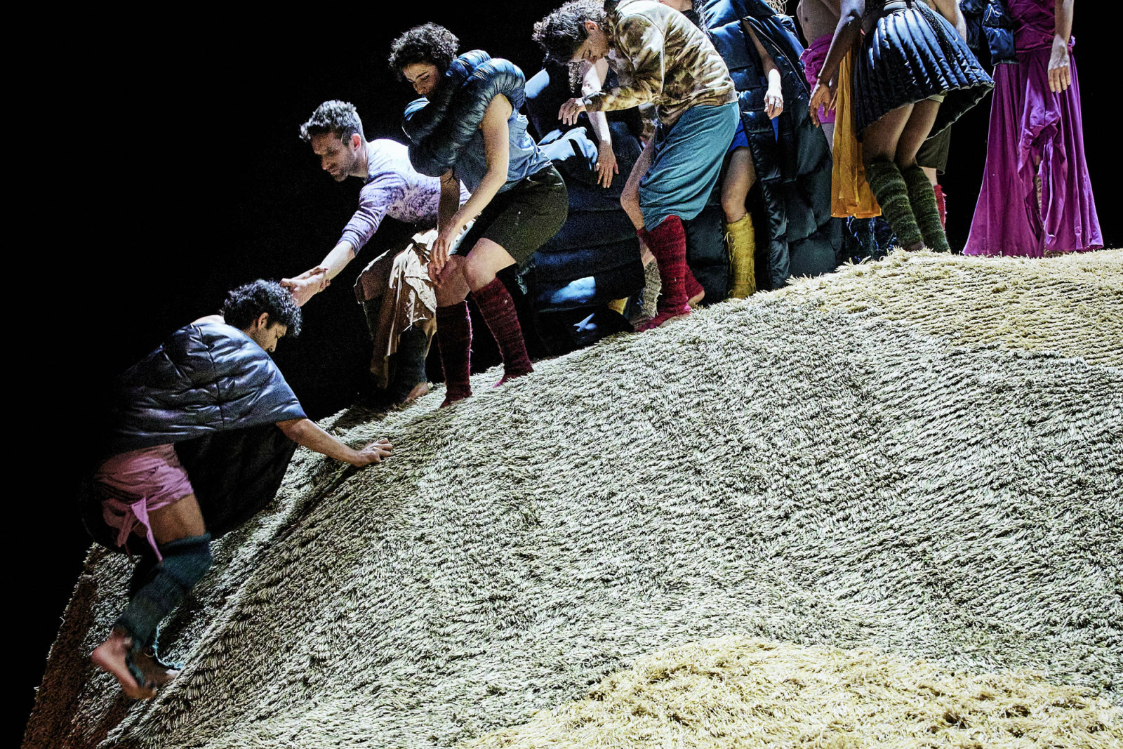 Au centre du plateau, une montagne de terre et de verdure : un tumulus, antique forme tombale. Un long cortège de treize corps chantants et dansants le parcourt dans une procession colorée et envoûtante, en constante métamorphose. Dans une alchimie parfaite, le chorégraphe François Chaignaud [au TAP, entre autres, avec Romances inciertos, un autre Orlando, 2019] et le directeur musical des Cris de Paris, Geoffroy Jourdain, inventent une cérémonie inédite mêlant danse et chants, polyphonies de la renaissance et œuvres contemporaines. Telle une onde ininterrompue, la chorégraphie se propage de corps en corps. Gestes et voix créent organiquement une communauté magnifique, sans qu’on ne distingue plus — et c’est là une prouesse — qui est chanteur, qui est danseur. Un moment suspendu.